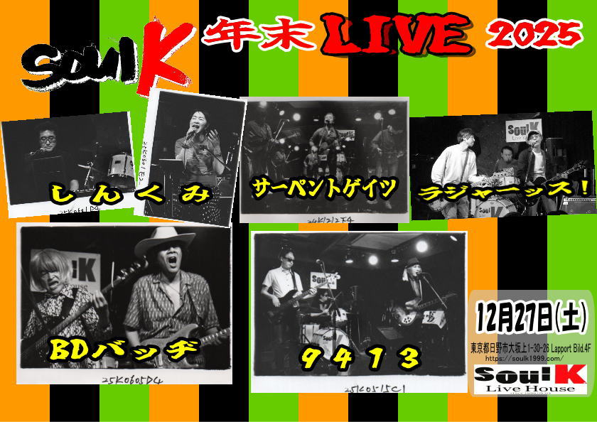 12月27日(土)2025 年末ライヴ 2025 年末ライヴ ・Open 17:00 ・Charge ¥2,000(+オーダー) 出演: 17:30~17:40 The Dusty Broom / 17:50~18:20 しんくみ 18:30~19:00 サーペントゲイツ / 19:10~19:40 ラジャーッス! 19:50~20:20 BDバッヂ / 20:30~21:00 9413 « 12月28日(日)2025 年末ライヴ 12月26日(金)Soul K Blues Jam Vol,146 »